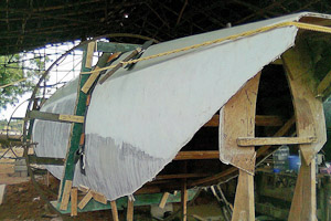 Pour l'instant, le bateau est construit à l'envers. Beaucoup plus simple pour fabriquer les coques, qui reposent sur les futures cloisons structurelles. Mais pour continuer le boulot, il faut maintenant retourner les coques pour pouvoir stratifier l'intérieur.